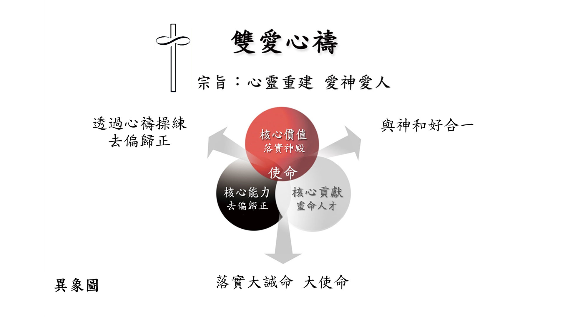 - 第一圈是核心價值,就是個人歸心向神,落實為神的殿,與神合一,這是目的。